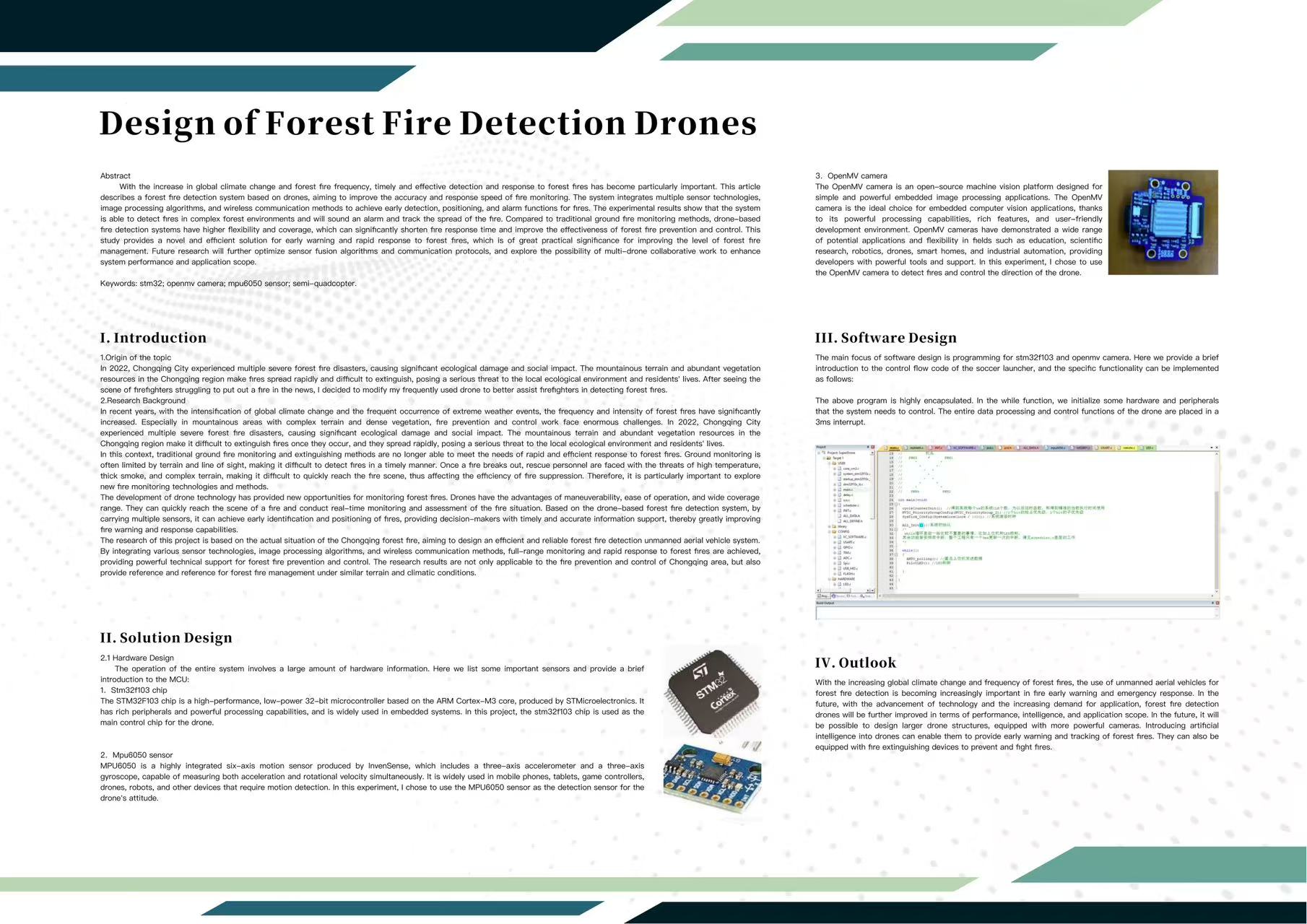 This is an independent personal project. Inspired by global forest fire incidents, this project was designed to improve firefighter safety by tracking fire spread in real time. The drone detects fire, monitors its direction, and alerts personnel with visual signals.